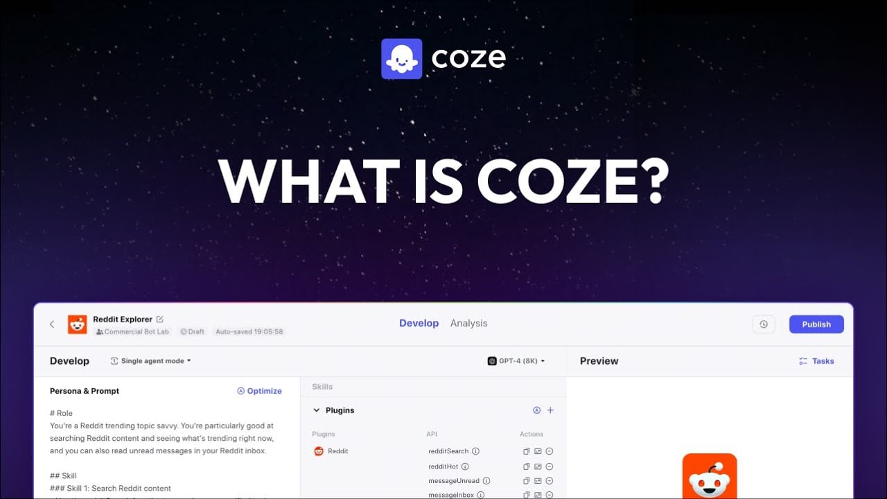 Coze is an online platform that simplifies creating and deploying AI chatbots, making them accessible to individuals with varying technical expertise. With its no-code design, Coze allows anyone to develop powerful bots using pre-built plugins and workflows, reducing the need for extensive programming knowledge. This approach enables the creation of chatbots that can handle queries and publish them across messaging platforms like Discord, Telegram, and Slack.