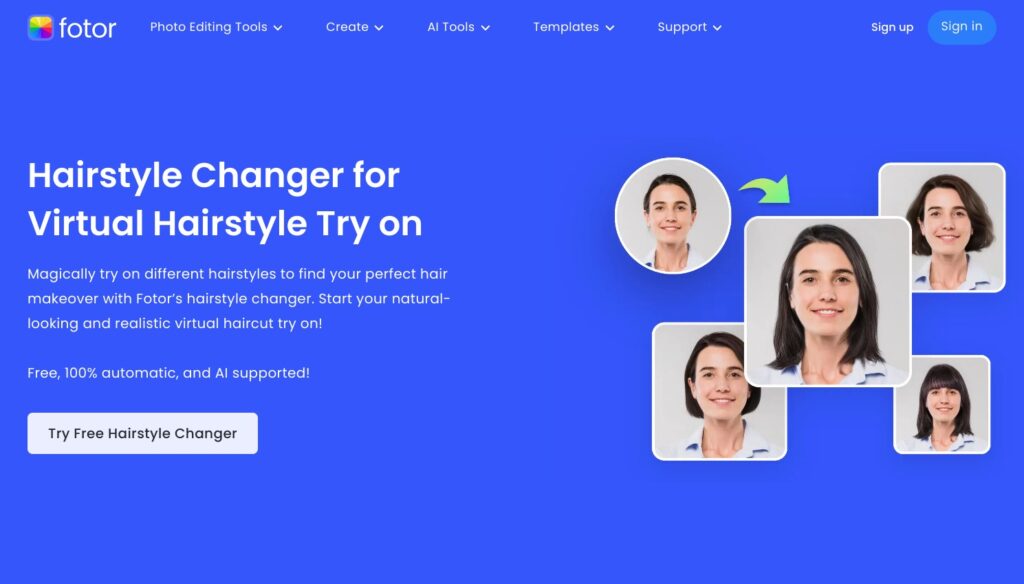 Part of the AI-powered Fotor photo editing tool, Fotor Hairstyle Changer lets you magically try on different hairstyles to find your perfect hair makeover.
