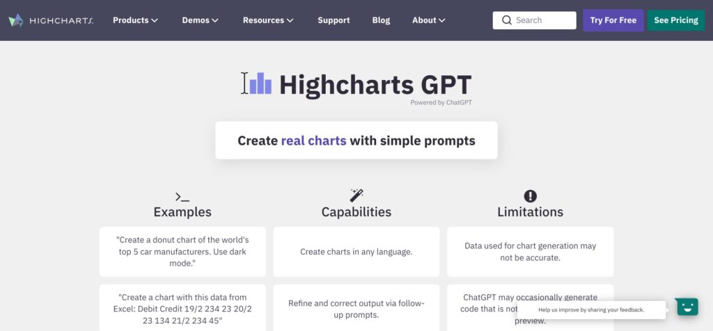 Highcharts GPT is a part of the bigger package (tool) Highcharts, which makes it easy for developers to create charts and dashboards for web and mobile platforms. It is not really a tool for the general public, but it does work with all the popular programming languages and frameworks — including Javascript, Angular, React, VueJS, iOS, R, .NET, Python, and more.