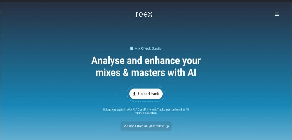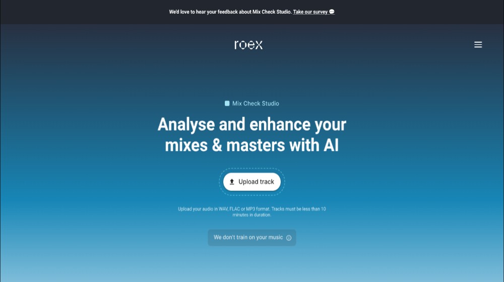 Mix Check Studio is an AI-powered web application by RoEx that analyzes audio tracks to provide feedback on mixing and mastering. Users upload WAV or MP3 files, select a genre, and receive a Mix Check Report detailing issues like clipping, phase problems, stereo field balance, and loudness levels. The tool offers genre-specific suggestions to improve audio quality. The Mix Enhance feature applies AI-driven processing to polish tracks, mimicking professional studio effects. No account is required, and the service is free. RoEx ensures user privacy by deleting uploaded files after analysis. The platform has processed over 1.7 million tracks since April 2023.