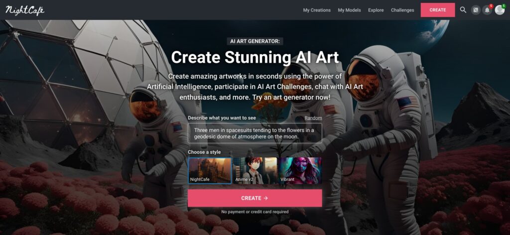NightCafe Creator is a web and mobile AI art generation platform that transforms text prompts into images using multiple models including Stable Diffusion, DALL-E 3, and Flux.