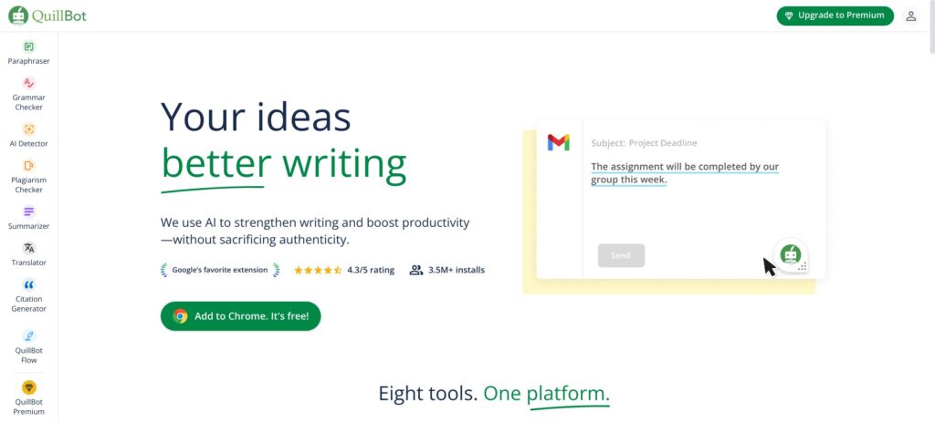 QuillBot is an AI-powered writing assistant that refines text with tools for paraphrasing, grammar checking, tone analysis, and more, making it a go-to for students, professionals, and content creators. Its Paraphraser reworks sentences in modes like Standard, Fluency, or Creative, keeping meaning intact while boosting clarity. The tool integrates with Chrome, Word, and Google Docs, streamlining workflows. It is built for clear communication without overriding your voice.