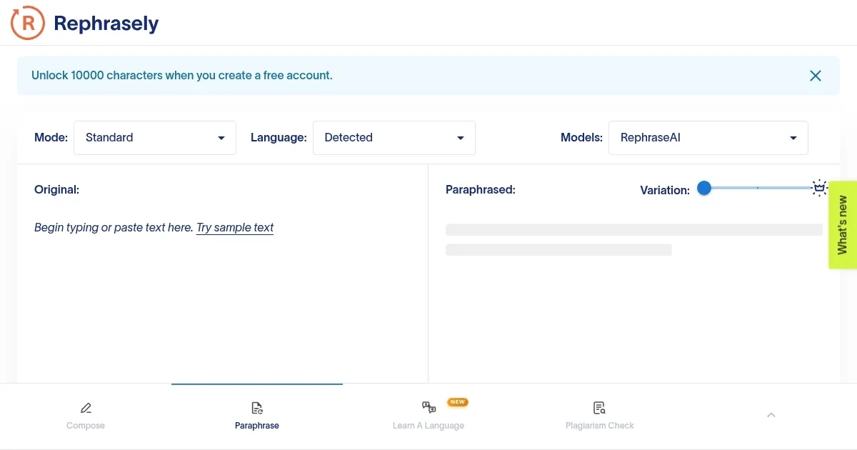 Compared to competitors, Rephrasely offers more language options than QuillBot, which has fewer modes but a smoother interface. Paraphraser.io provides similar features but with a 600-word free limit, while Scribbr focuses heavily on academic use with fewer creative options. Rephrasely’s pricing is competitive, with a free tier and affordable premium plans, though exact costs aren’t disclosed on the site.