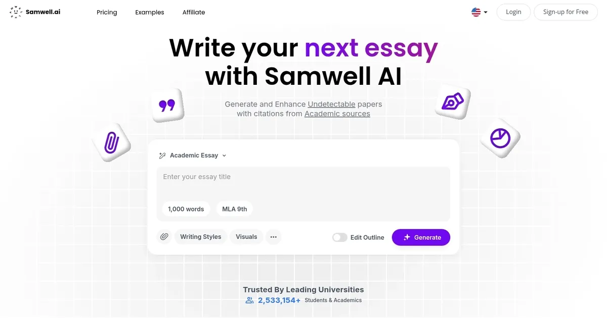 Samwell is a cutting-edge AI-powered tool designed to assist students and academics in creating essays and research papers with a focus on academic success. It offers a range of features designed to make the writing process more efficient and intuitive, including the generation of undetectable AI content, in-text citations, access to authentic sources, a plagiarism checker, and even video references.